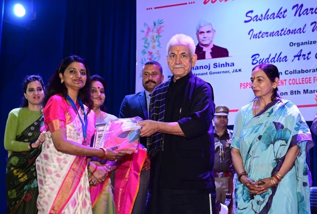 JAMMU, MARCH 08 (KNS): The Union Territory of Jammu Kashmir today celebrated the International Women’s Day. The Lieutenant Governor Manoj Sinha joined the ‘Sashakt Nari Samman’ event organized by Buddha Art & Painting, in collaboration with Padma Shri Padma Sachdev Government College for Women, Gandhi Nagar.